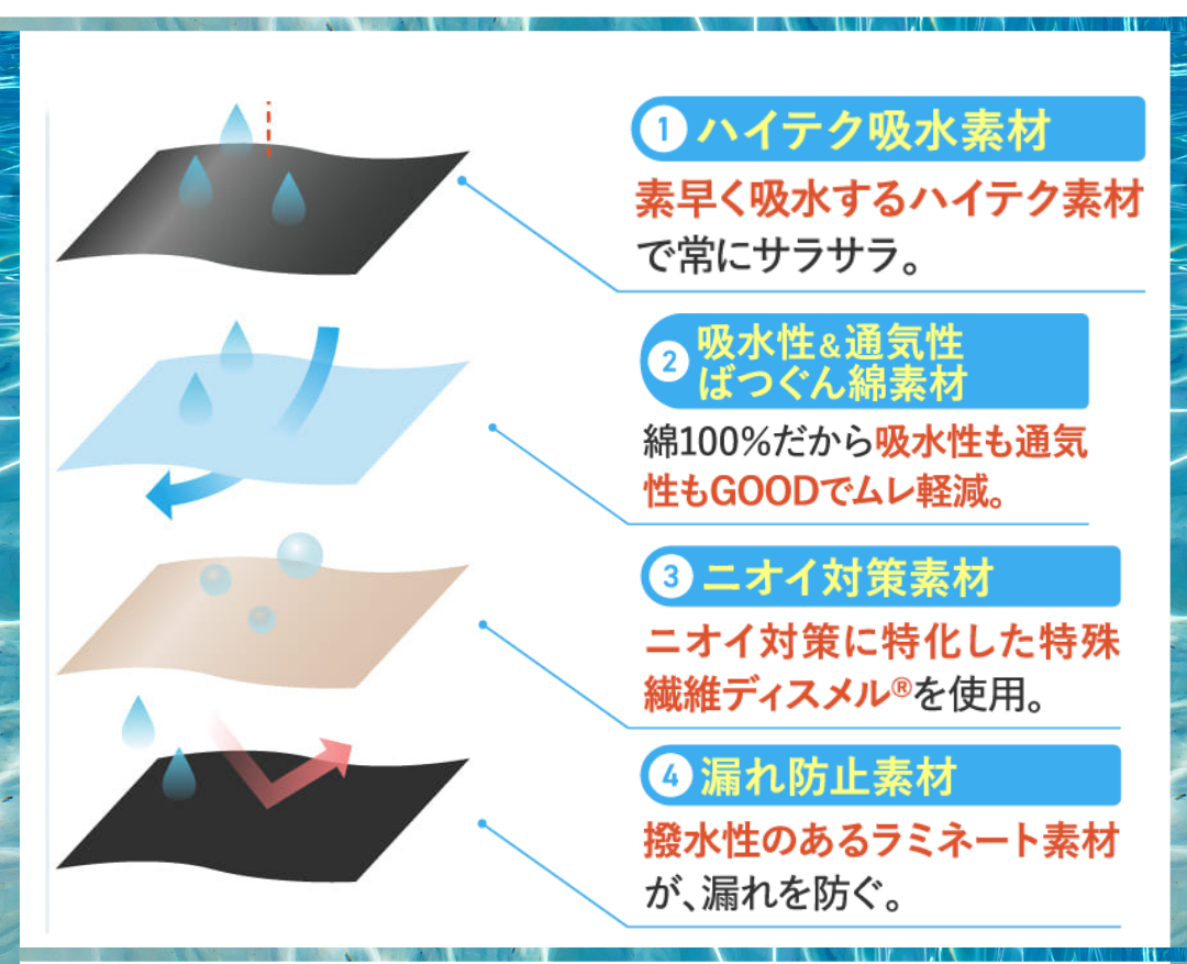 パンツの部分とパットの部分が別になっていてしっかり当たるのと、下着の付け根周りの円形が太ももにぴったり当たるような布の加工がされているので 横漏れの心配が少なく感じました。